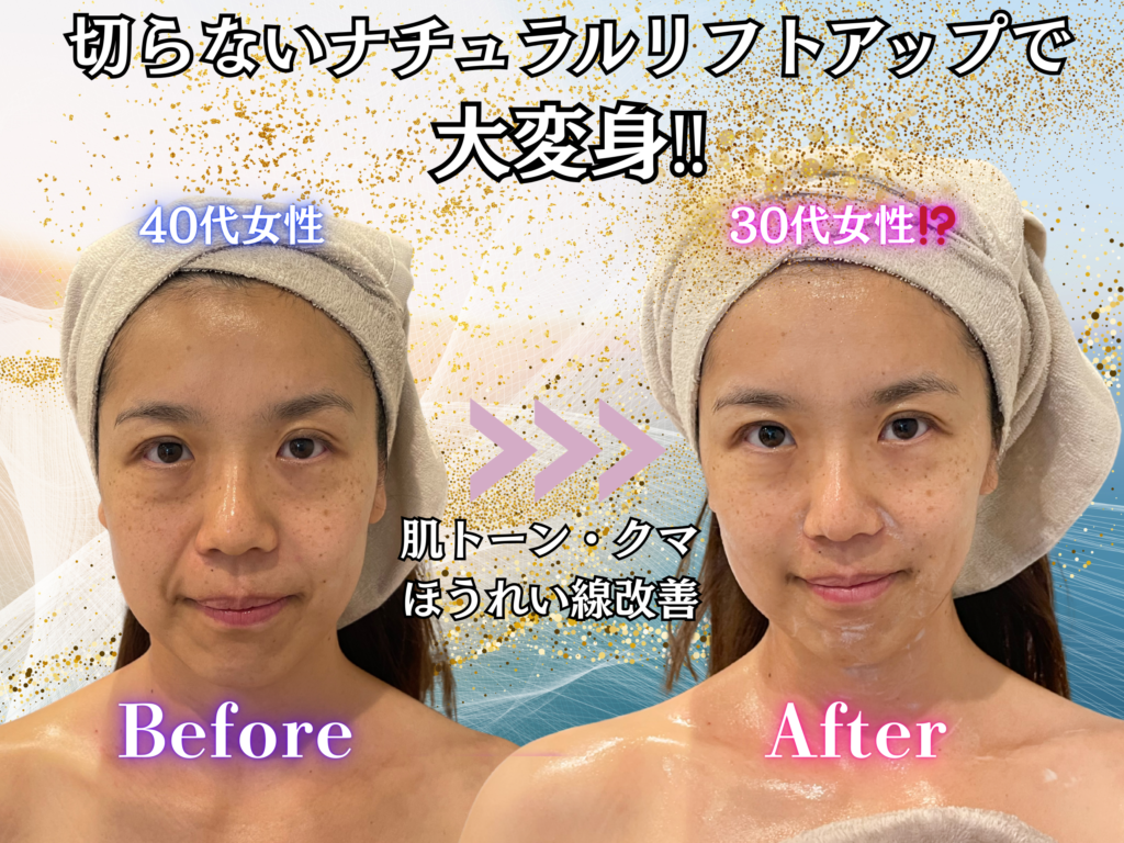 - 切らない吊り上げない整形。ナチュラルリフトアップでシワ・たるみ・くすみ・クマ・ほうれい線を徹底改善。目標-10歳の若見えを実現。
